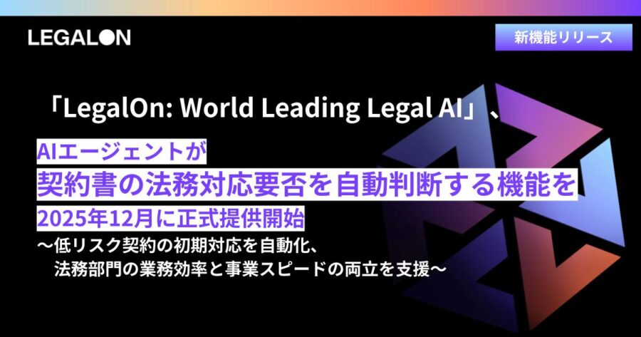「LegalOn: World Leading Legal AI」、AIエージェントが契約書の法務対応の要否を自動判断する機能を2025年12月に正式提供開始~低リスク契約の初期対応を自動化、法務部門の業務効率と事業スピードの両立を支援~