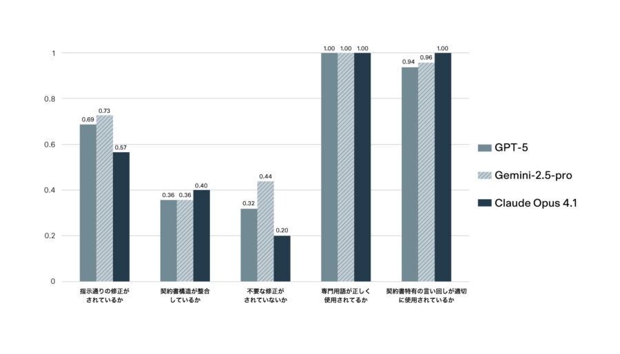 Claude Opus 4.1は『契約書構造が整合しているか』で0.40、『契約書特有の言い回しが適切に使用されているか』において1.0と最高スコアを記録し、契約書としての体裁を維持することに長けていることがわかりました。一方で、『不要な修正がされていないか』は0.20と最も低く、指示にない余分な変更を行う傾向が強いことを示しています。