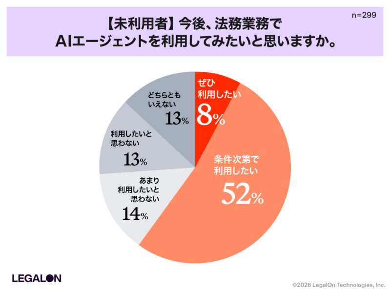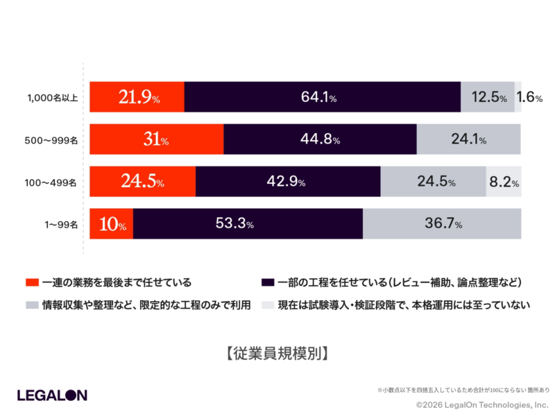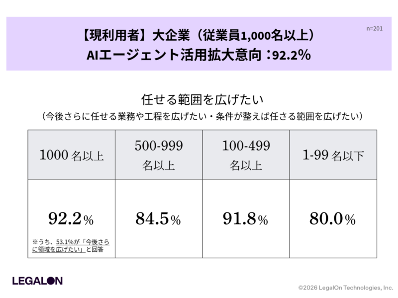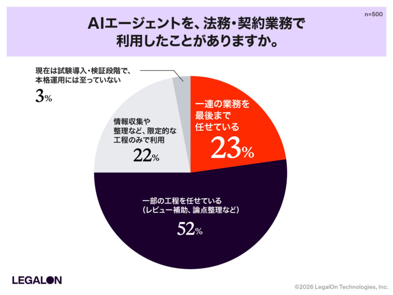 株式会社LegalOn Technologies(本社:東京都渋谷区、代表:代表取締役 執行役員・CEO 角田 望、以下:LegalOn Technologies)は、企業に所属し日常業務として法務業務に関与している会社員および会社役員500名を対象に、法務業務におけるAIエージェント活用の実態調査を実施しました。