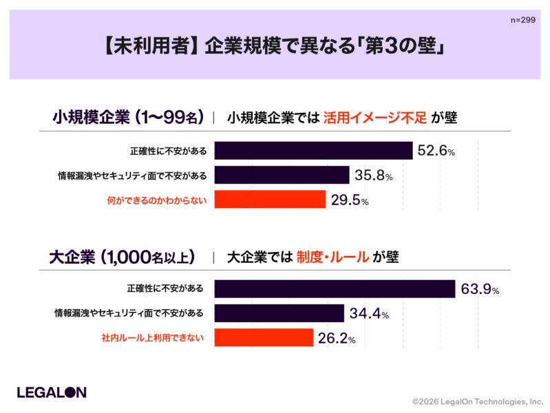 企業規模別に見ると、小規模企業では「何ができるかわからない」「法務で利用するイメージがわかない」といった理解不足が相対的に課題となる一方、大規模企業では「社内ルール上利用できない」が目立ち、セキュリティやガバナンス整備が導入のボトルネックとなる傾向が見られました。