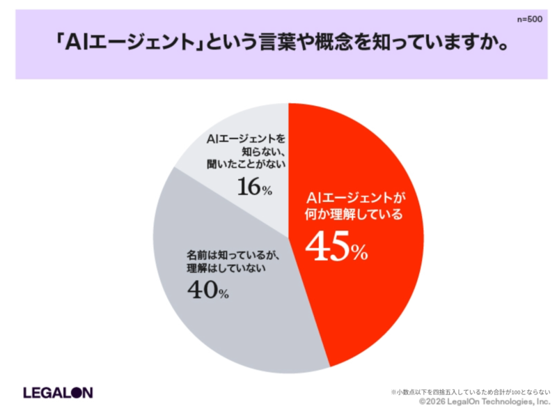 株式会社LegalOn Technologies(本社:東京都渋谷区、代表:代表取締役 執行役員・CEO 角田 望、以下:LegalOn Technologies)は、企業に所属し日常業務として法務業務に関与している会社員および会社役員500名を対象に、法務業務におけるAIエージェント活用の実態調査を実施しました。