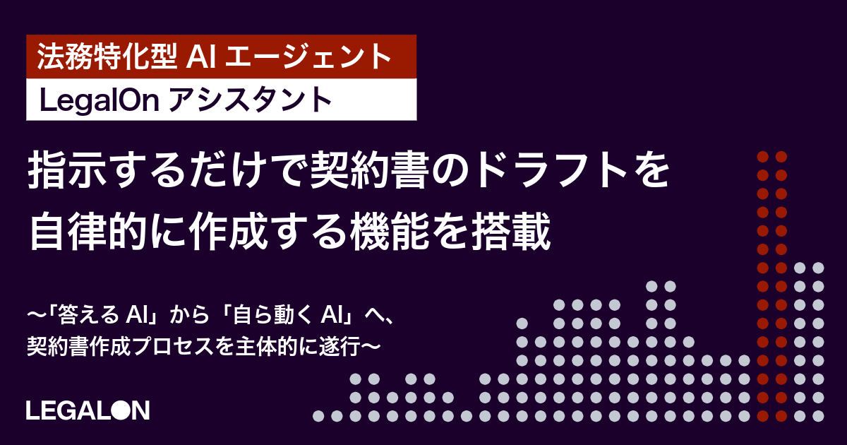 法務特化型AIエージェント搭載のProfessional AI for Legal「LegalOn」は、国境を越えて非効率な法務業務を一掃し、お客様の法務チームが思考と決断にフォーカスし、法務起点で企業を成長させるサービスです。「LegalOn」に搭載されている法務特化型AIエージェント「LegalOnアシスタント」が、法務相談、マターマネジメント、リーガルリサーチ、契約書レビュー、契約書管理など、法務業務における煩雑な確認作業や正確性が求められるタスクをサポート。弁護士監修コンテンツや外部情報と連携しながら自律的に処理を行い、業務を行う中で自然とナレッジが蓄積される環境を実現します。