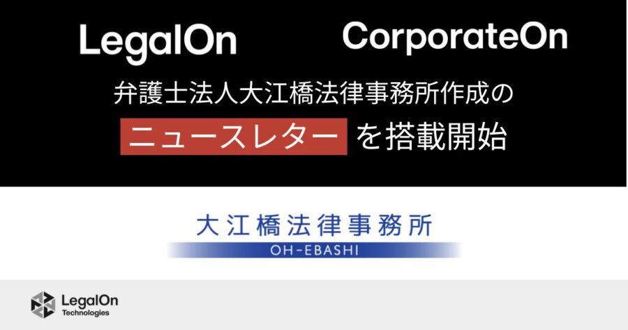 株式会社LegalOn Technologies(本社:東京都渋谷区、代表取締役 執行役員・CEO:角田 望)は、「LegalOn: World Leading Legal AI」( https://www.legalon-cloud.com/)およびAIカウンセル「CorporateOn」( https://www.legalon-cloud.com/corporateon )に、M&Aやコーポレートガバナンス、独占禁止法や規制対応、不動産・金融取引、保険・行政法務など幅広い分野に強みを持ち、企業や行政機関に質の高いリーガルサービスを提供する弁護士法人 大江橋法律事務所(事務所所在地:大阪府大阪市)が作成する最新の実務に即した専門的なニュースレターを10月から搭載します。